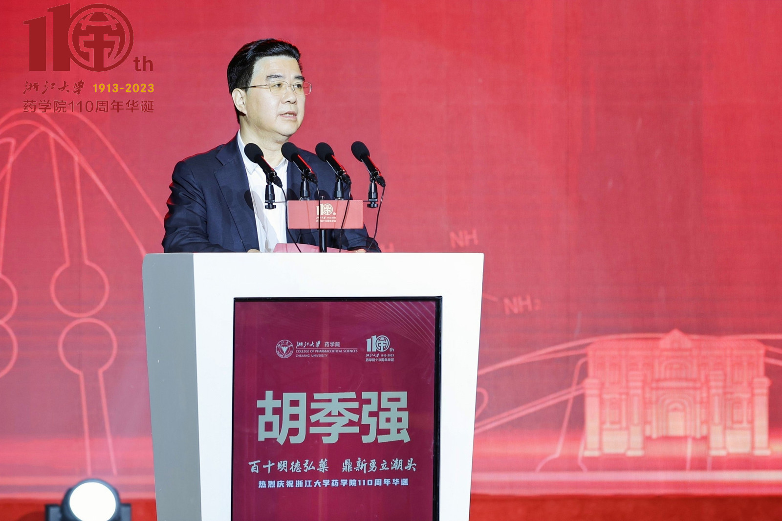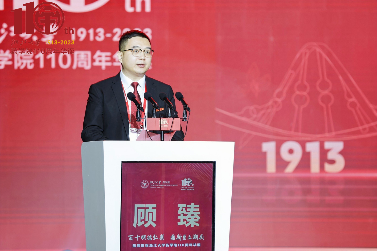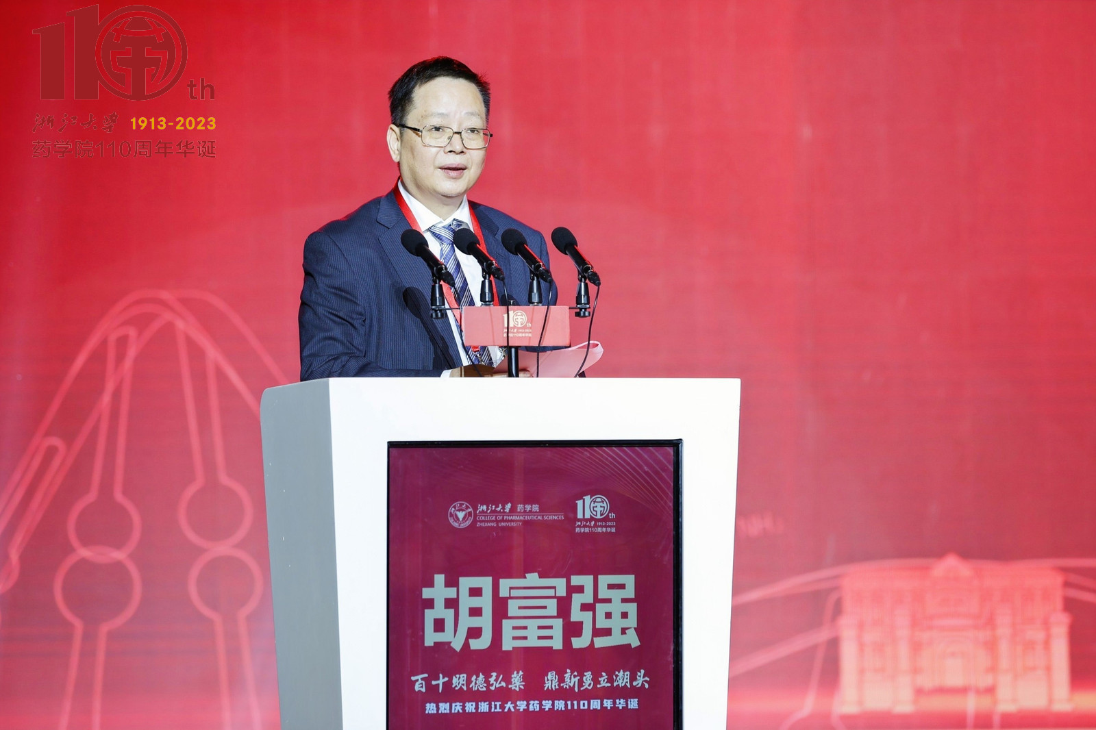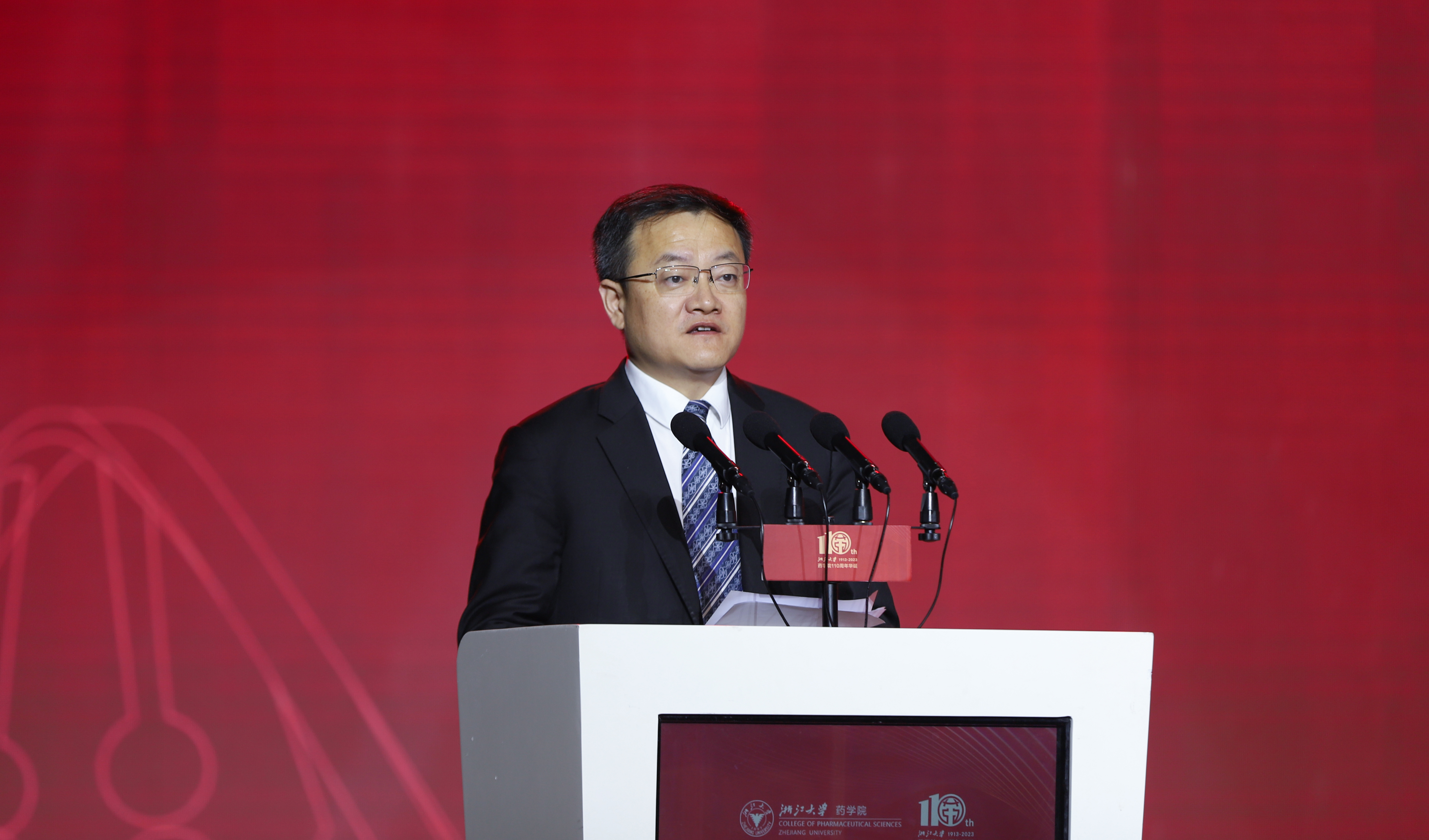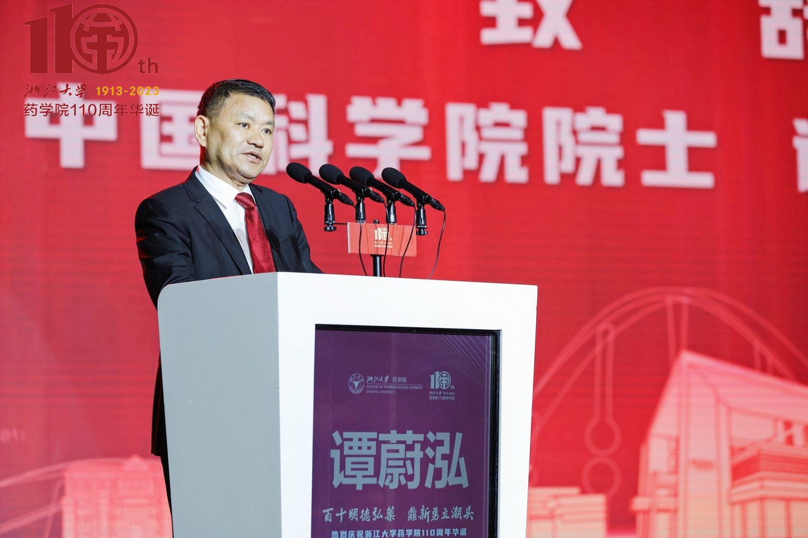 谭蔚泓代表浙江大学药学院发展委员会委员致辞。他指出,浙江大学药学院经过110年的筑基、扩展、开拓、飞跃,主要办学指标取得历史性突破,浙江大学药学院发展委员会也将全力支持学院的发展和建设,为学院的内涵式、高质量发展建言献策。