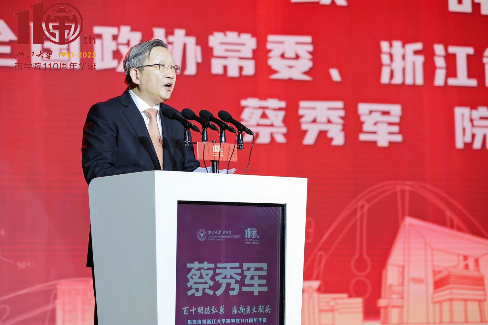 蔡秀军代表浙江省政协向浙江大学药学院师生员工和海内外校友表示热烈的祝贺。他指出,浙江大学药学院围绕“四个面向”战略导向、坚定世界一流战略目标、抢抓国重重组战略机遇、实施拔尖造峰战略行动、做实资源拓展战略支撑,主要办学指标实现令人瞩目的高质量跨越。期盼学院打造引领学科交叉融合的“风向标”、构建精医懂药复合型人才的“蓄水池”、点燃大健康科创高地建设的“推进器”,引领生物医药产业的航船,驶向更加广阔的星辰大海。