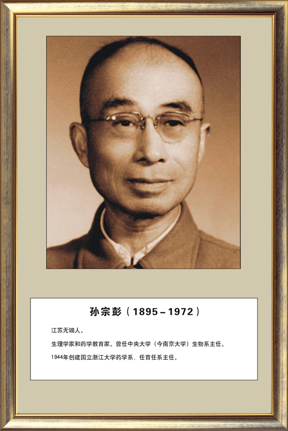 孙宗彭(1895-1972)江苏无锡人。生理学家和药学教育家。曾任中央大学(今南京大学)生物系主任。1944年创建国立浙江大学药学系,任首任系主任。孙教授创办理学院药学系有三个特点:一是确定以培养研究型的药学人才为目标,充分吸取浙大理学院有关学科的特长,与药学专业授课融合成一体的特色,为国内开创培养高级药学科研人才;二是尽一切可能从国内外筹措经费,购置教学、科研仪器,这是当时国内药学院校所少有的;三是在国内外聘请一流的专业授课教师。
